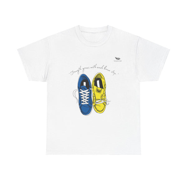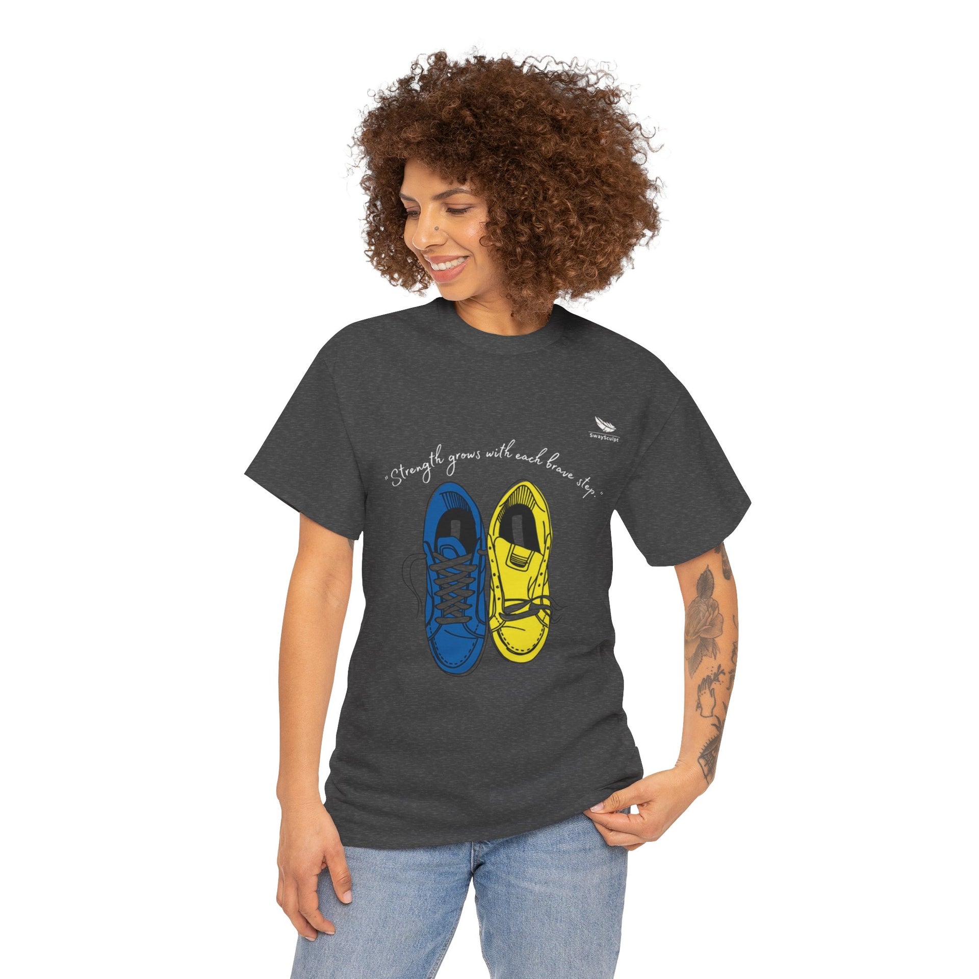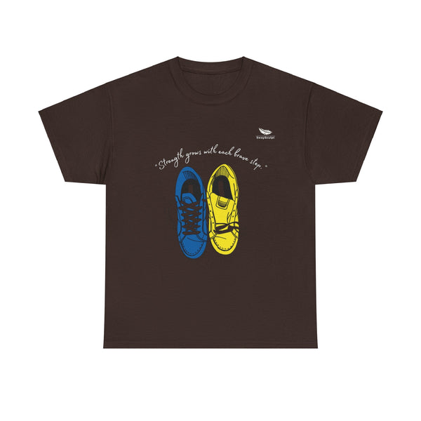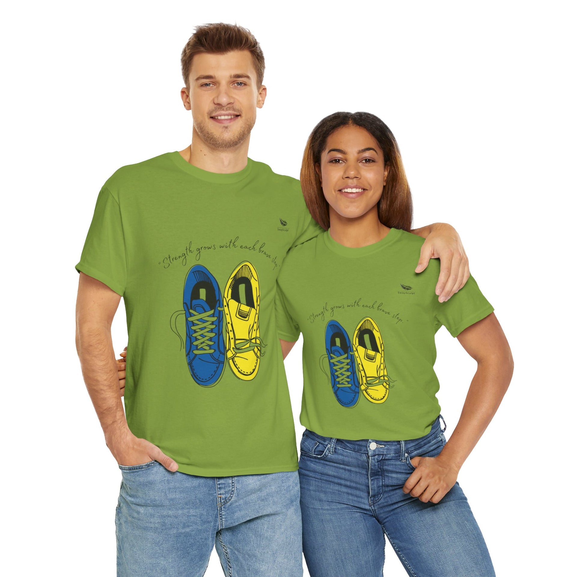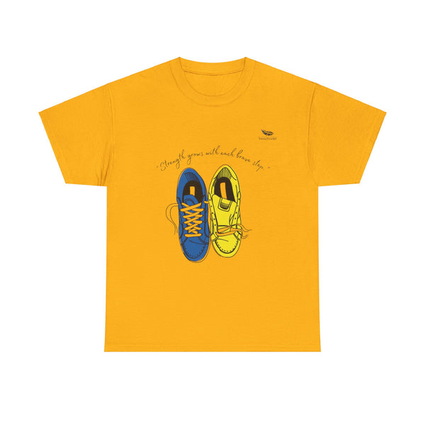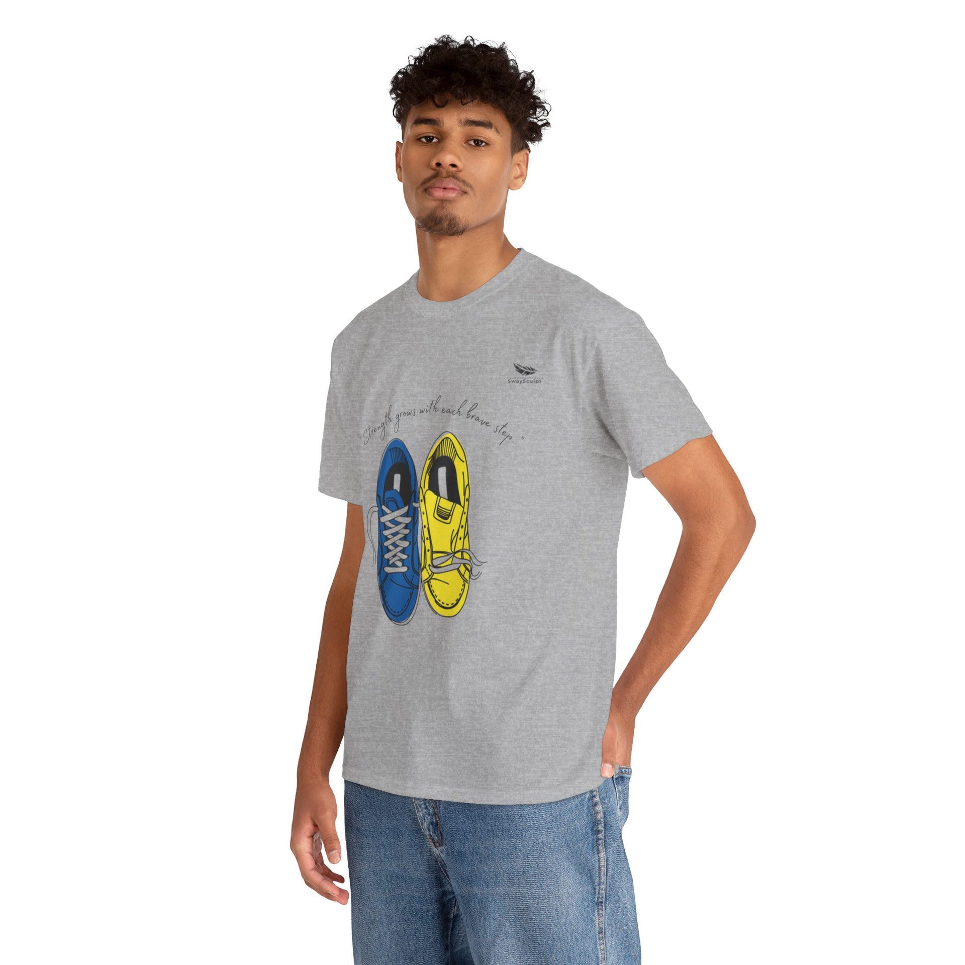 Embrace the journey with our Unisex Heavy Cotton Tee - 'Steps of Strength'. Featuring a poignant message, "Strength grows with each brave step," paired with contrasting blue and yellow shoes, this shirt is not just a fashion statement—it's a banner for courage and progress.