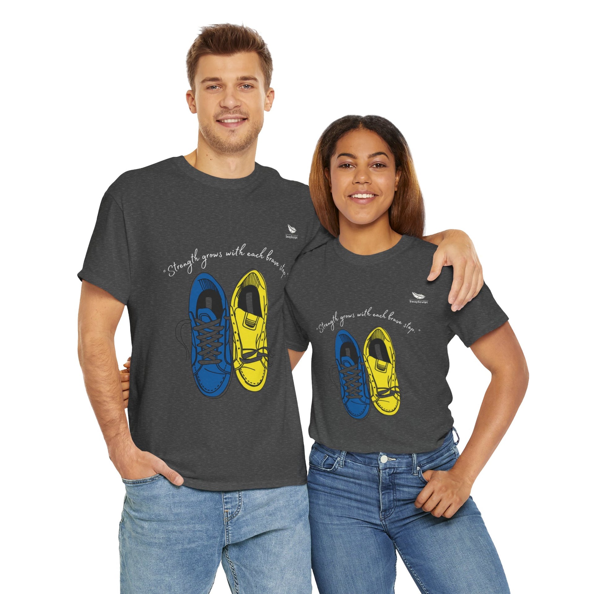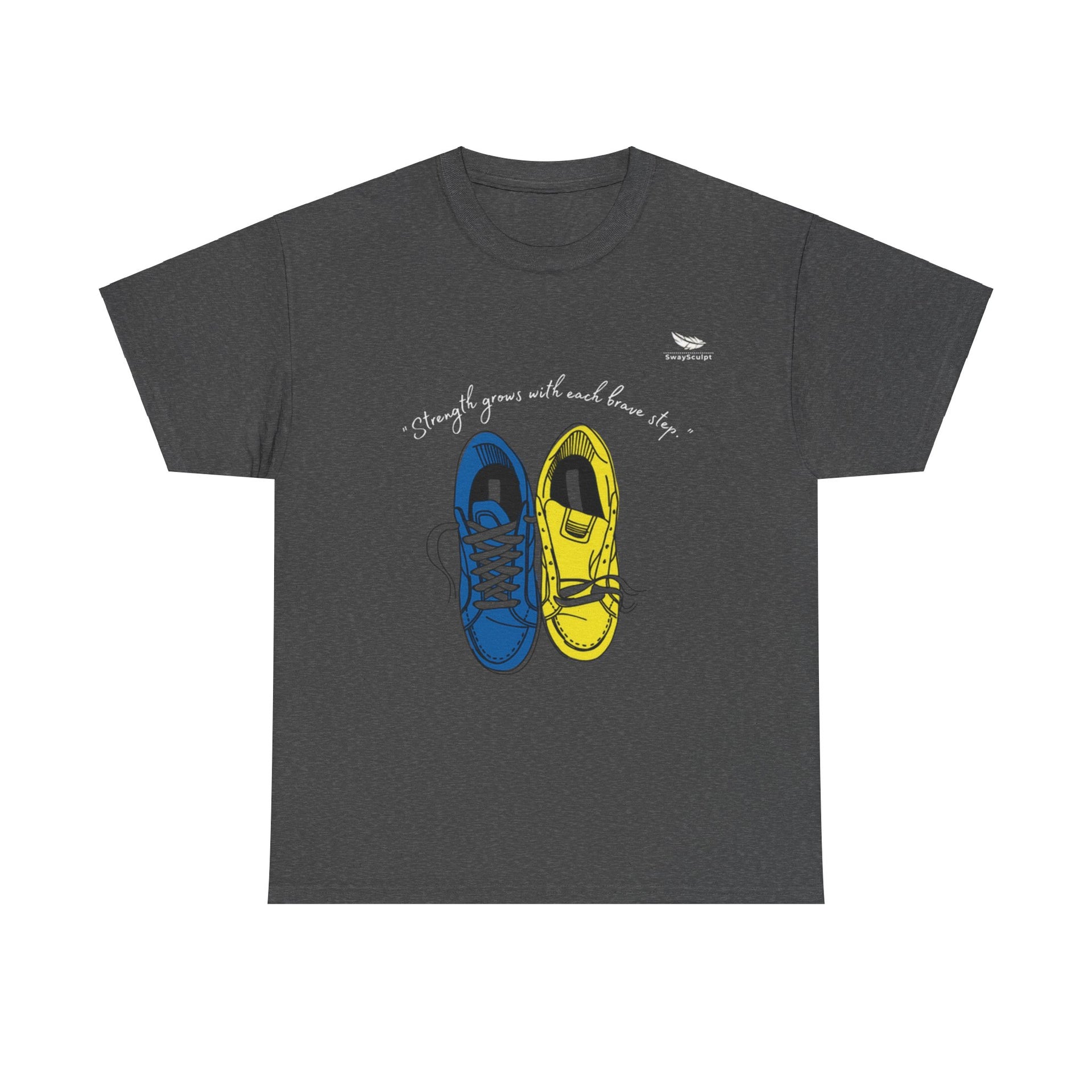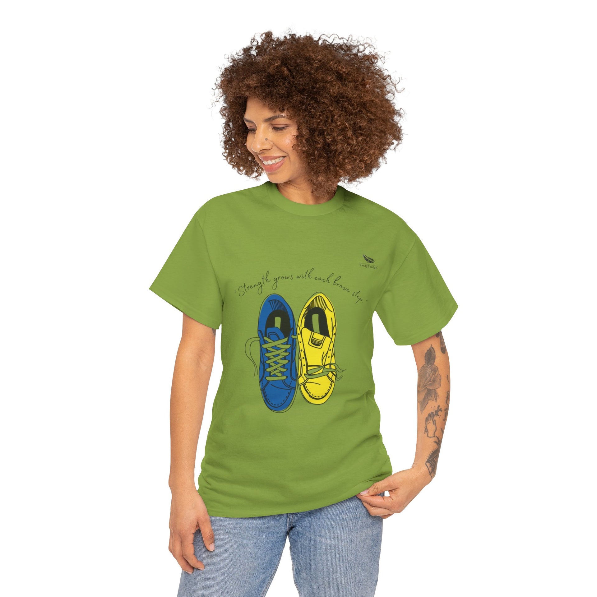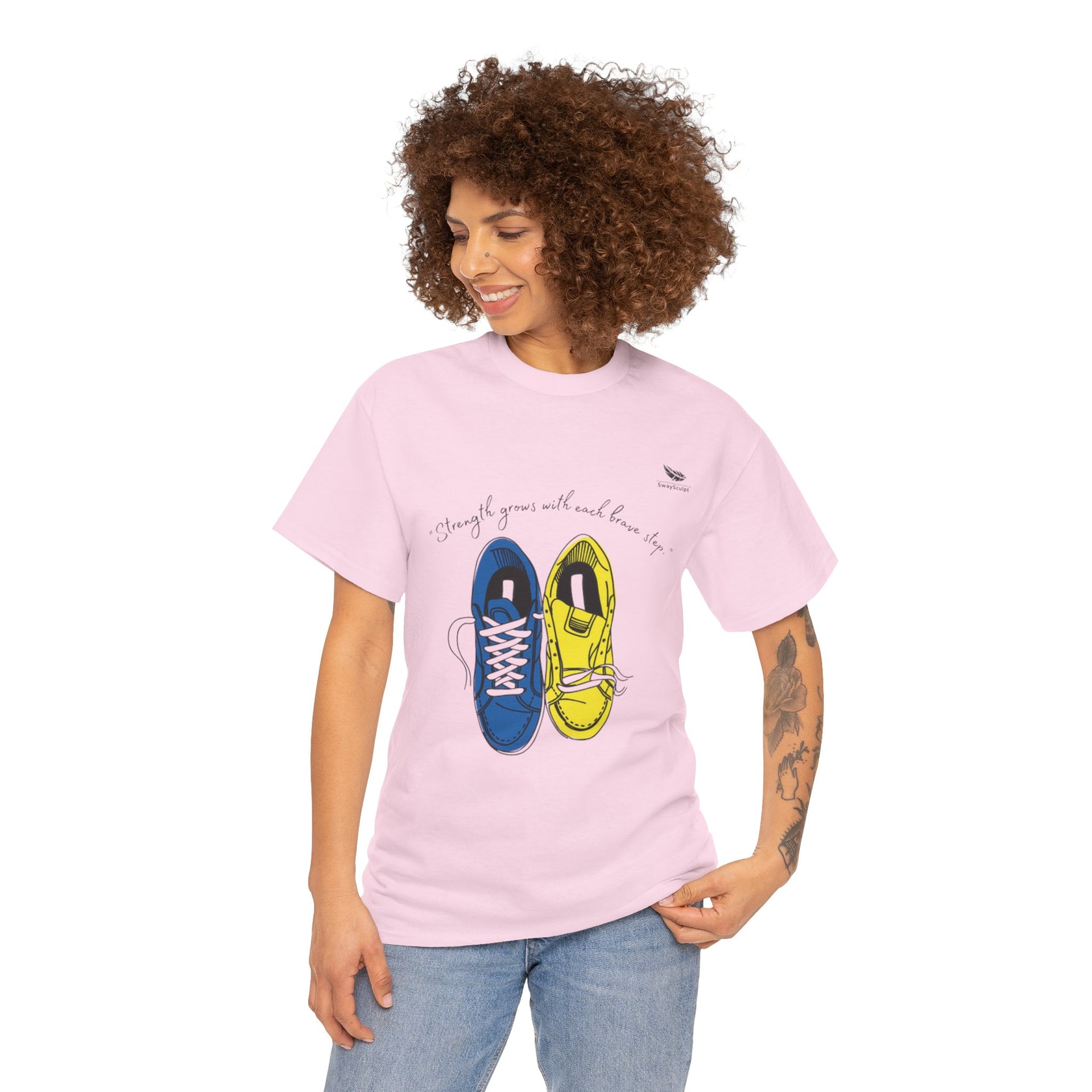 Embrace the journey with our Unisex Heavy Cotton Tee - 'Steps of Strength'. Featuring a poignant message, "Strength grows with each brave step," paired with contrasting blue and yellow shoes, this shirt is not just a fashion statement—it's a banner for courage and progress.