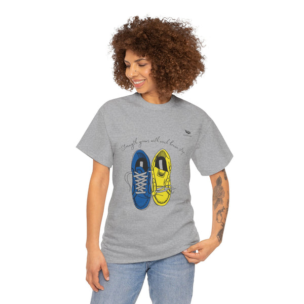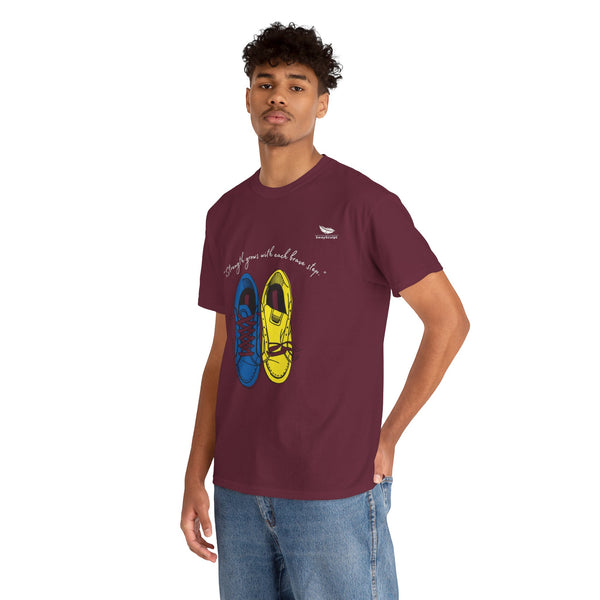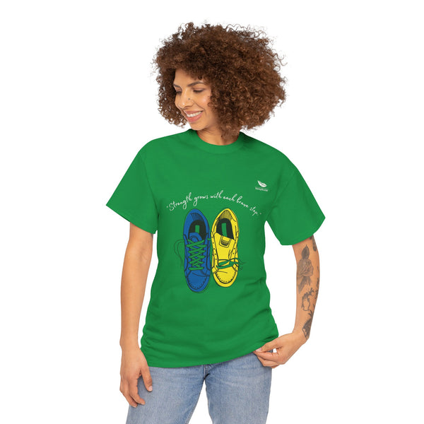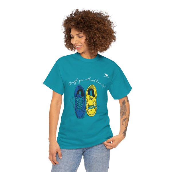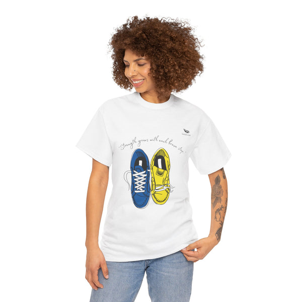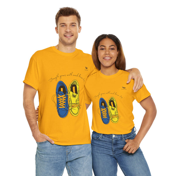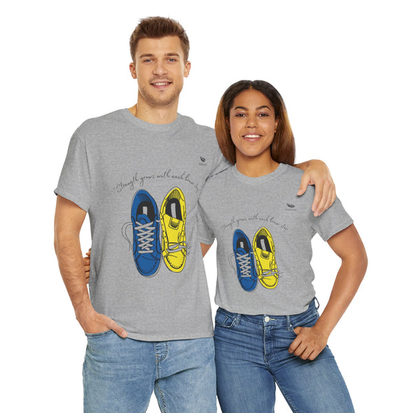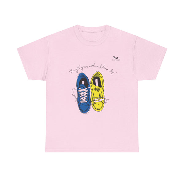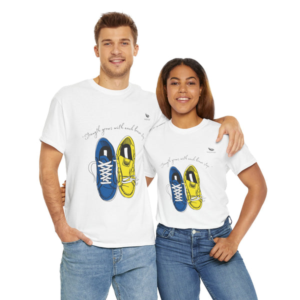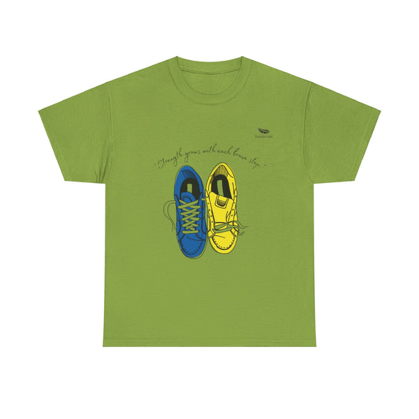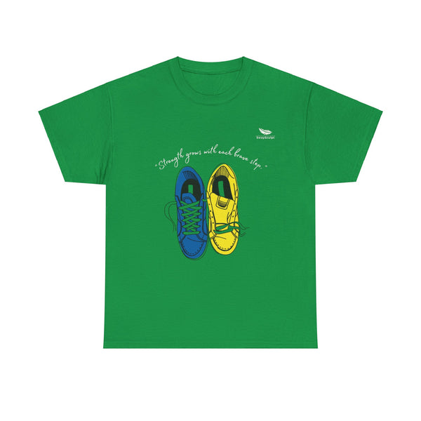 Embrace the journey with our Unisex Heavy Cotton Tee - 'Steps of Strength'. Featuring a poignant message, "Strength grows with each brave step," paired with contrasting blue and yellow shoes, this shirt is not just a fashion statement—it's a banner for courage and progress.